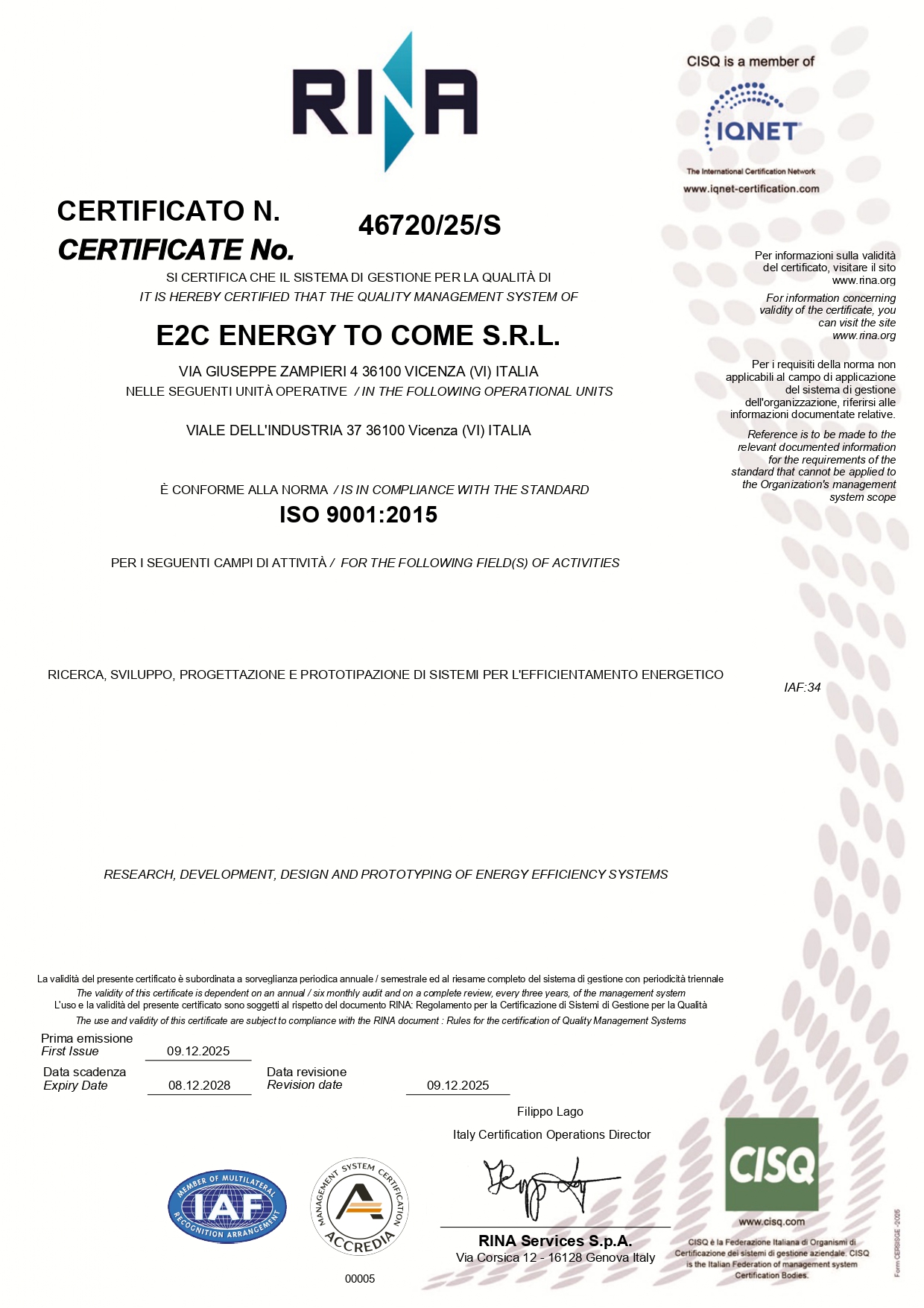 E2C è certificata ISO 9001, lo standard internazionale per i sistemi di gestione della qualità. Questa certificazione attesta il nostro impegno nel garantire processi organizzativi efficienti, orientati al miglioramento continuo e alla soddisfazione del cliente. Operiamo secondo criteri riconosciuti a livello internazionale, offrendo qualità e affidabilità in ogni fase del nostro lavoro.